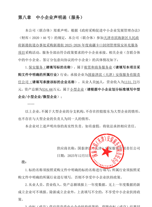| 天津市滨海新区人民政府新港街道办事处采购新港街2025-2026年度南疆卡口封闭管理保安补充服务项目(项目编号:TJBH-2025-D-0217)成交结果公告 |